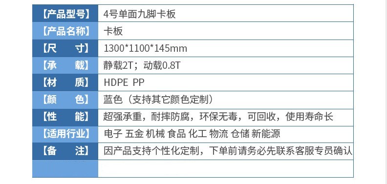 產品簡介:1310九腳托盤,塑膠卡板,加厚九腳塑料托盤