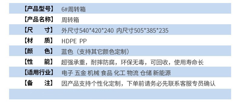 本店產品常規庫存為全新料藍色塑料托盤,周轉箱,周轉籮,化工桶,中空板材及部分高性價比黑色一次性出貨產品。如需要其他顏色請聯系客服對接處理。因產品規格較多,未能全部上至店鋪,如店中沒有您需要的規格尺寸也請聯系客服。希望能解決您的問題,我們竭誠為您服務!??!